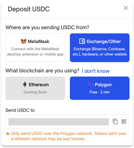5\) Paste your address into your exchange, send USDC over the Polygon network, and receive the funds in under a minute!